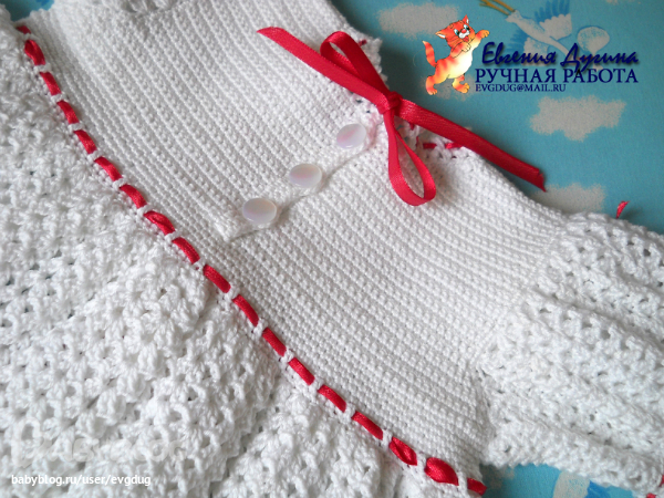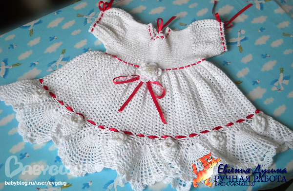 Женечка! Как красиво связано платьице! Так аккуратненько! Супер! Особенно рюш на платье - "ананасы", кажется, узор называется! Очень хочу научиться вязать такой же!