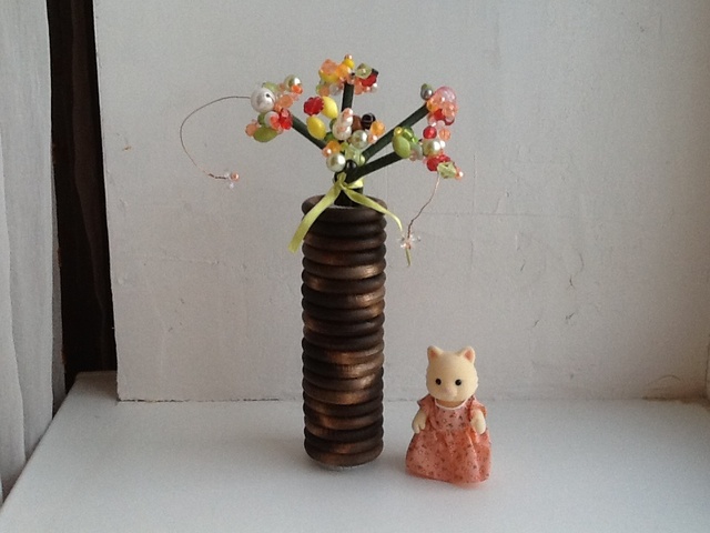 Ваза из деревянных кружочков (от корниза), картона и крышечки.
