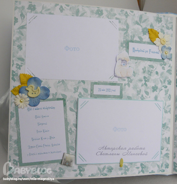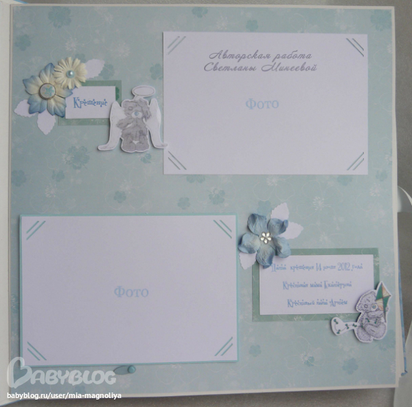 Ольчик, спасибо! ну прям столько комплиментов Я меня такая схема: сначала на листе скрап-бумаге (страничке) все делаю: уркашения, подложки под фото, в общем все, все, всеПотом уже готовую страницу клею на основу. Как бы объяснить, в общем, я в основном работаю с переплетами, так страницы у корешка, если плохо проклеить или только на скотч , то будут отходить, поэтому я три стороны (т.е. края) покрываю липкой лентов, а ту сторону, которая будет у корешка , аккуратно тонким слоем момента покрываю. Это значит по периметру. Теперь цент, его всю поверхность сраницы покрываю тоже моментов (момнет кристалл имею в виду). Потом кладу на старницу основы (переплета), все правильно располагаю, чтоб отступы были одинаковые и все было симметрично, а потом уже отлипляю ленту у липкой ленты и все края приклеиваю, ну и тщательно у корешка)) на след день, когда все высохнет, проверяю, если где-то что-то отходит, подклеиваю моментом аккуратно надеюсь понятно написала)))