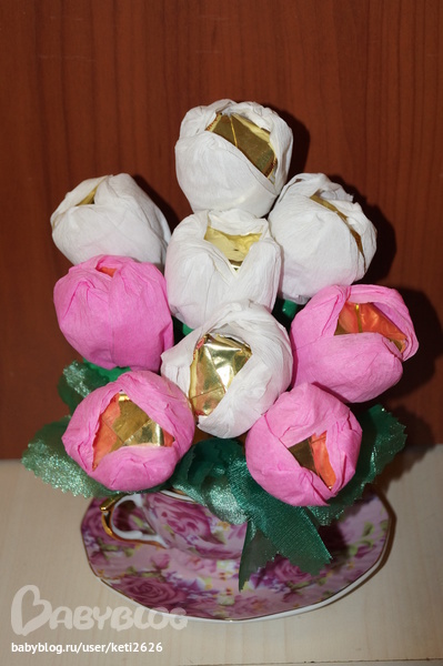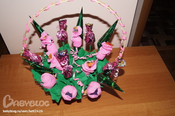 для крокусов и тюльпанов нужно брать круглые конфетки, бутоны будут по другому смотреться. В корзинке все цветы находятся в хаосе, нужно добавить побольше цветов или скомпоновать поплотнее уже имеющие цветы.