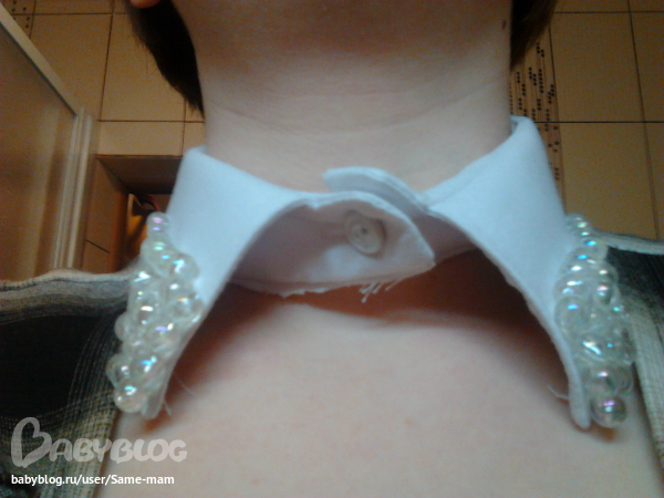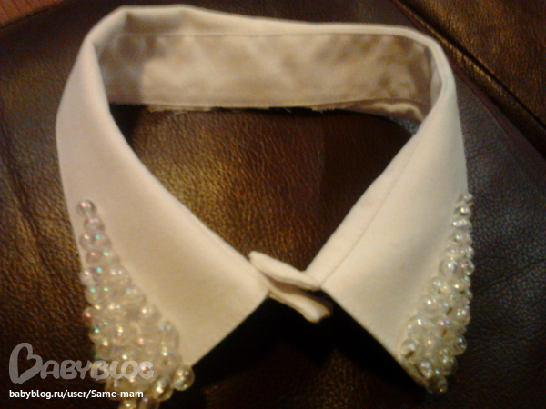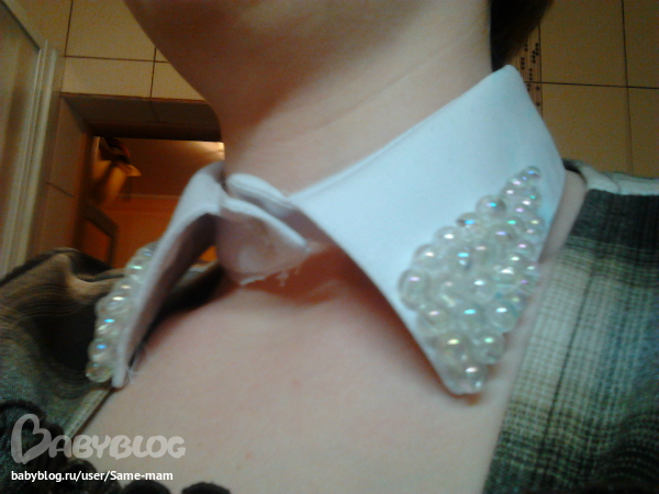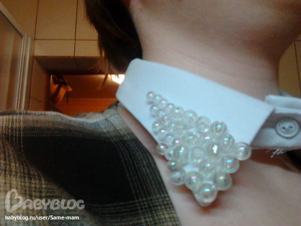 И вот нашла я у себя старую не нужную белую рубашку, одевала всего пару раз... ткань отличная, цвет белоснежный, но носить ее я из-за фасона уже не буду, и я решила что хочу себе модный аксессуар!!! отрезала воротник, купила бусины 2х размеров и вот что вышло.