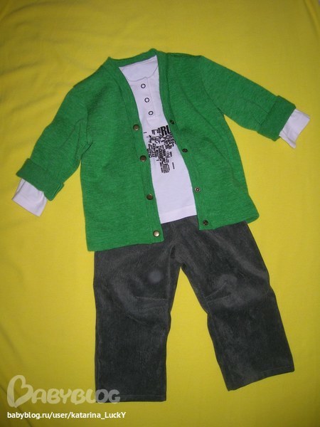 Комплект состоит из футболки с длинным рукавом, кардигана и вельветовых джинс.