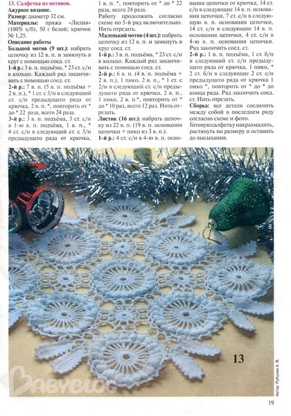 только вязать ее стоит нитками ирис и крючком максимум №1 (я вязала крючком№ 0,95). Если крючок взять чуть толще, получается не совсем то. Меня с этой салфеткой так занесло, ято я накидки большие связала на диван и кресло, можно посмотреть вот здесь.