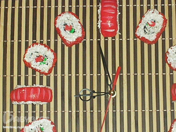 вот такие часики получились для моего брата на день рождение. Любит он кушать суши, и меня научил их готовить.