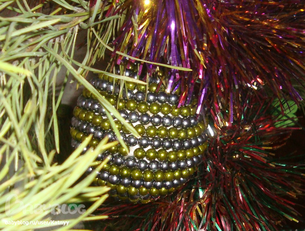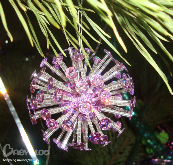 Вторая-года три назад, мне кажется, весь инет ими был заполнен. Пенопластовый шарик, пайетки, рубленый стеклярус, канцелярские иглы. Муж был в шоке, когда сыночку не было еще 3-х лет, а он все собирал и втыкал в шарик и так аккуратно.