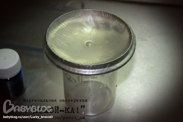 На крышку нужно надеть пакетик и вылить основу, ароматизированную отдушкой. Я использовала мяту и ментол в кач-ве добавки.