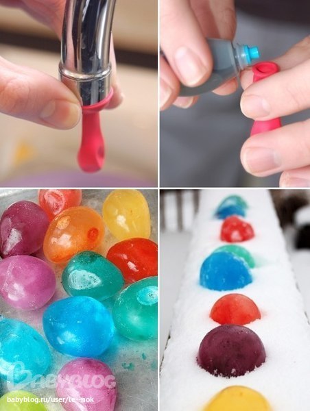 Заполнить воздушные шарики водой, добавить пищевого красителя и когда вода замерзнет шары удалить.