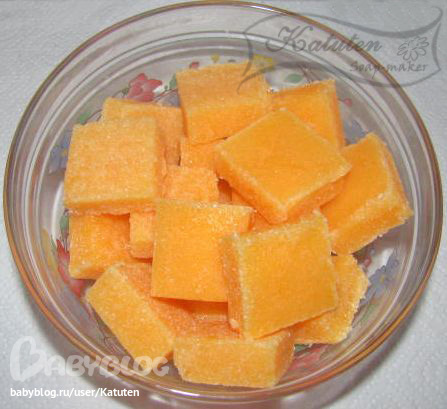 Растопила основу и масла в одной массе, разлила в две ёмкости, добавила в один отдушку клубника, в другной киви и красители, затем высыпала сахар туда и туда, перемешала, утромбовала и в холодильник. А когда разрезала, красная часть разрезалась безупречно, зеленная часть, частично крошилась(((((((((( Странно...