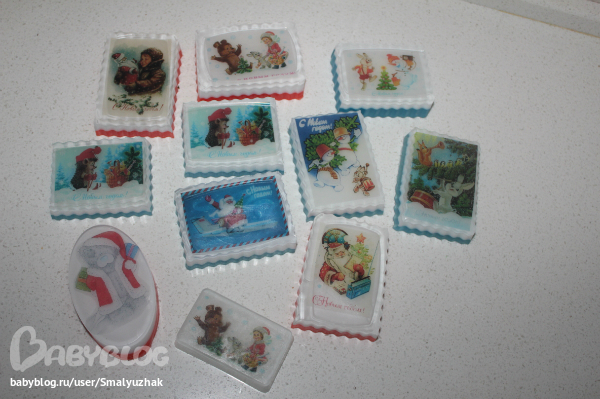 Мыло и косметика своими рукамиКроме черно-белых, еще решила цветных поделать! Ну и теддики, куда ж без них, а еще санты которые очень мне полюбились и открытки:)
