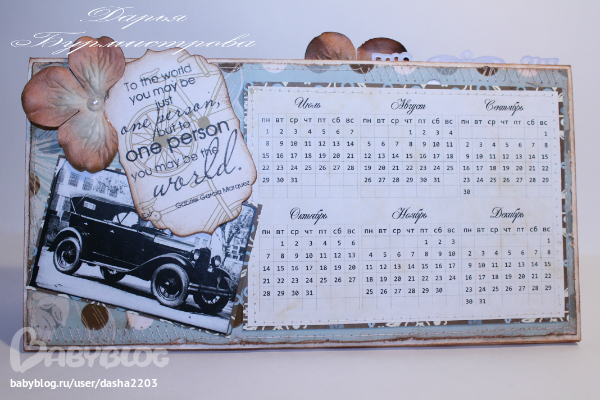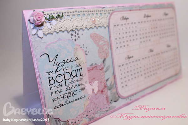 Дарья, добрый день! Я только-только начала изучение скрапбукинга. Благодарна судьбе, что увидела ваши работы. Стала частым гостем в вашем дневнике. Могу часами разглядывать и удивляться. Восхищению нет предела!!! Захотелось сделать календарик на рабочий стол. Всё вроде бы понятно. Но, если не трудно, могли бы вы подсказать, а шаблон к самому календарю у вас готовый или его можно сделать в какой-либо программе? Спасибо!
