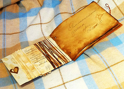 у меня не загрузились фотки кроме первой, но я твою идею мужу рассказала, но в качестве идеи сделать фотоальбом родителям его про внуков. Н у меня нет духавки и я не знаю чем состаривать бумагу)))). А вообще зная своего мужа то он бы до слез был тронут, дело же не в том аккуратно или нет или по-детски. дело в душевности-это то где есть кусочек твоей души. Кстати, а что если в качестве офрмления добавить на страничках или на главный лист вашу фотографию(если позволяет вмешательства)