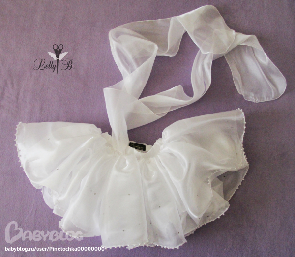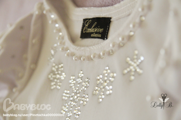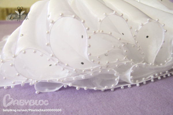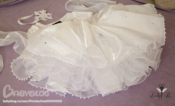 Юбка из органзы на леске, стразы, бусины по карю, пришивались вручную)) Пояс для банта зафиксировала впереди, чтобы не съезжал. Банты из органзы выходят очень воздушные и очень детские, обещали мне фото с ёлок, добавлю сюда))
