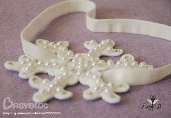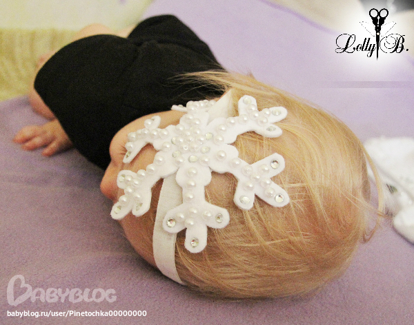 Просто шедевр! Таких красиых снежинок я ещё никогда не видела. И с повязочкой очень здорово придумали. Надо будет для своей доченьки на будущее взять на заметку. Спасибо за такую красоту!!!!
