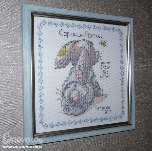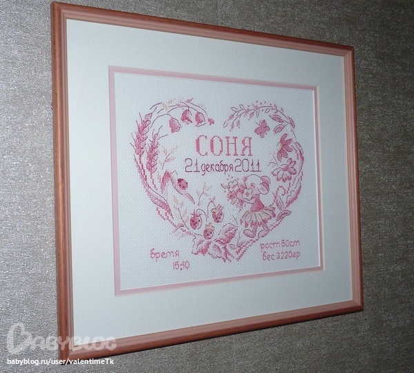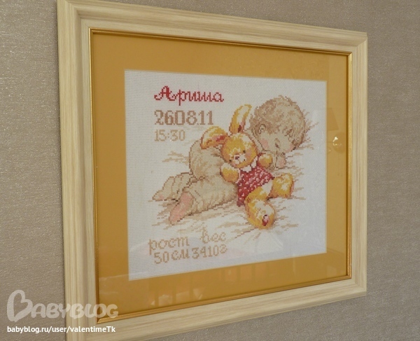 Метрика для доченьки была вышита в 2011 году, еще до ее рождения, ну а данные, имя и багет появились к ее первому годику