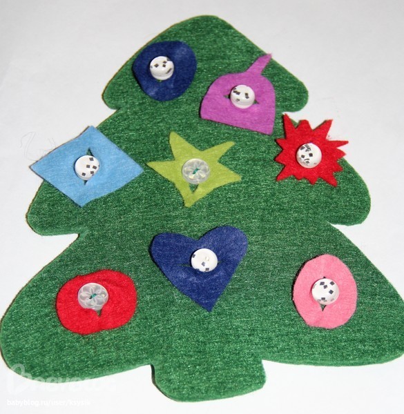 Вот такая елочка с игрушками. Вот здесь я поняла что Алешка очень плохо справляется с данным заданием(((( Но ни чего, для этого собственно и была сделана игрушка, чтобы развивать пальчики!