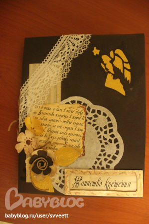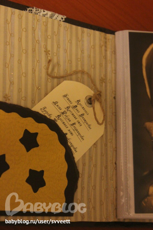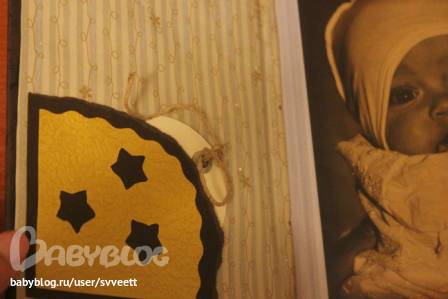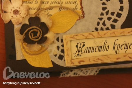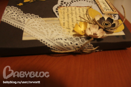 Бумага для скрапа и для пастели, кружево, салфетка из кофейни, картон, лак для ногтей), веревка упаковочная из Икеи. А внутри обычный альбомчик 10х15 - не выдержала бы делать скрап-страницы.
