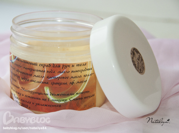 Состав: основа, минеральная вода, масло виноградных косточек, абрикосовое масло, касторовое масло, коллоидное серебро, цедра апельсина, скрабищие гранулы, эфирное масло апельсина.