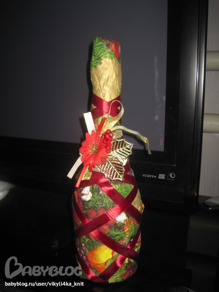 Мне потребовались: бутылка шампанского, две большие праздничные салфетки, скотч, атласная лента и игрушку с елки сняла))) А так, конечно, можно и еще пофантазировать...