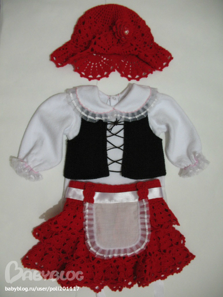 Юбочка, шапочка вязала крючком, желетку на машинке, фартук и кофточку сшила.