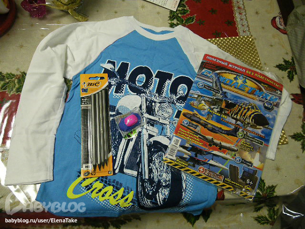 Старшему футболка с длинными руковами (я не знаю как они по-русски называются), в самый раз. карандаши простые, всегда нам актуальны, в школе же пишут карандашами, резинка )))) и журнал про самолеты, они с папой уже смотрели его вчера. От Лукаса отдельное спасибо.