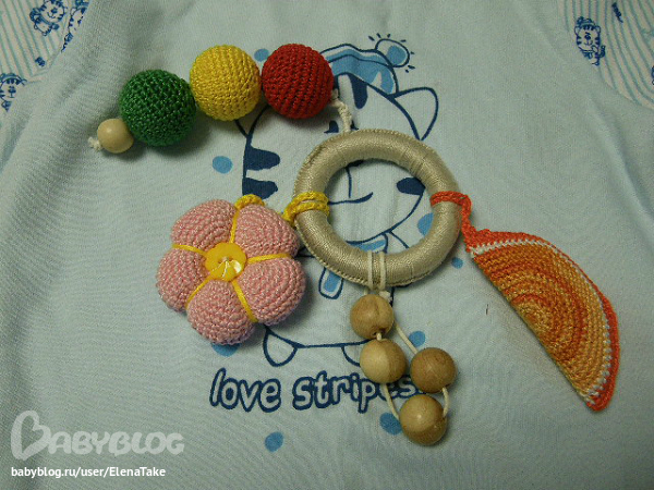 Младшенькому игруха, Наташа, она - супер! в жизни намного лучше, чем на фото. ух как понравилась. Так все аккуратненько, долька шуршит. Наташ, ты каким крючком обвязываешь, я, наверное вяжу большим крючком, у меня все не так плотно, а у тебя прямо так плотненько бусики обвязанны. Класс!