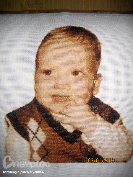 Добрый день! Вышиваю не так давно, около 2-х лет, очень хотелось вышить сына по фото. Почитав немало информации в Интернете сделала сама схему для вышивки, выставляю на Ваш суд. Размер 27*30 см, 150*166 крестиков, использовала 12 цветов, 4 бленда, брала палитру на Осинке. Вышивала 11 месяцев, не получалось быстрее. Кому интересно, добро пожаловать под кат. Хотелось бы услышать Ваше мнение. Я вижу, что 100%- ной схожести нет, но я старалась.