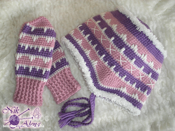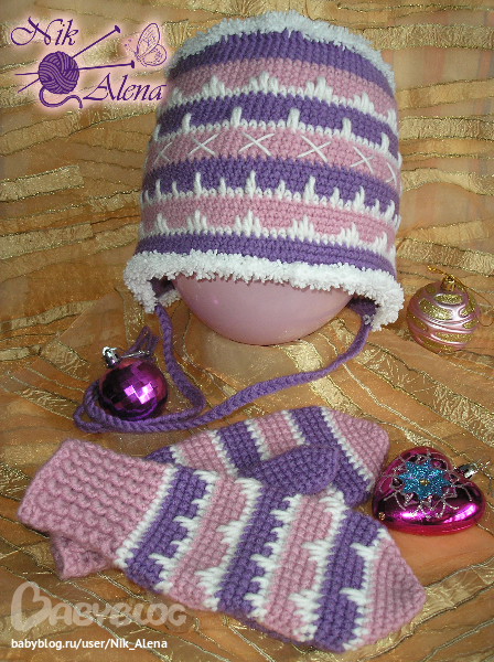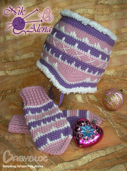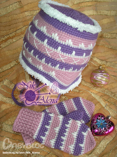 Связался у меня в подарок вот такой зимний комплект - шапочка и варежки, шапочка двойная - подклад тоже связан, для девочки 7 лет, на размер 52см. (под катом много фото)