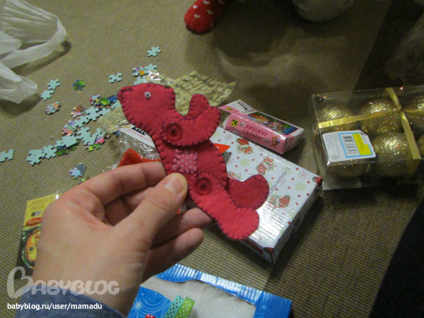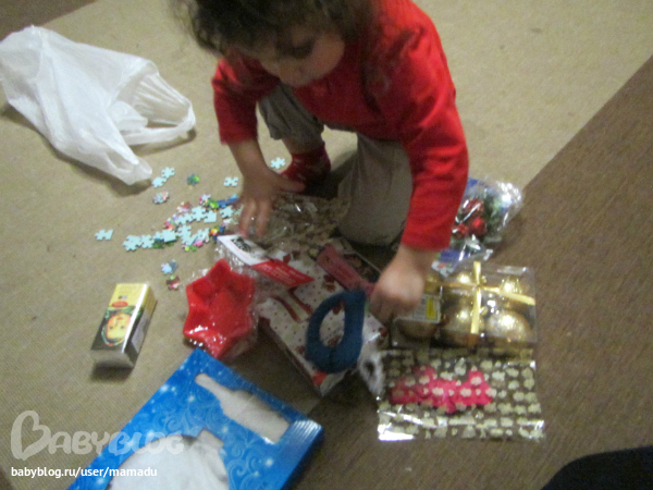 Вот так вот растаскивались подарки :))) Шарики моментально повешены были на елочку, все коробочки вскрыты и ценности спрятаны!