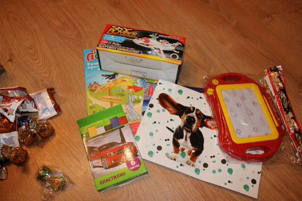 Это подарочки Гошке: самолет, альбом для рисования, пластилин и доска.