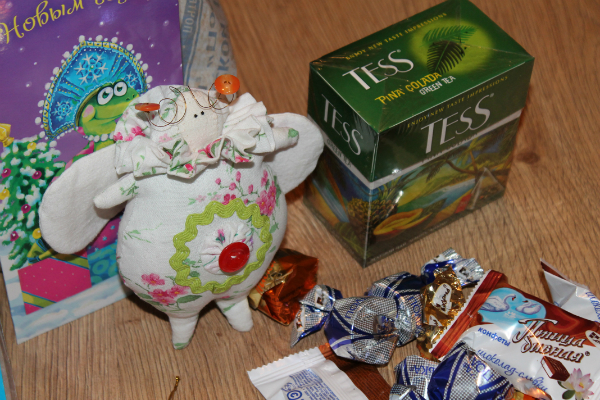 Вот здесь скорее весь вид подарка и это должно быть выше остальных фоток, но опишу чуть подробнее: открытка с пожеланиями, набор для вышивания, куча лент, бусин, пуговиц, набор для шитья гномика, диск с фильмом, кусочек аромантногот мыла и что же еще-то???? а вспомнила, вот эта пузатая Венька, такая смешная, висит уже рядом с Пуськой в моей машине. Очень здорово