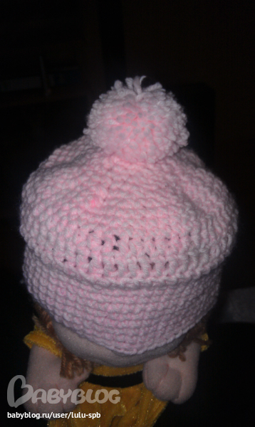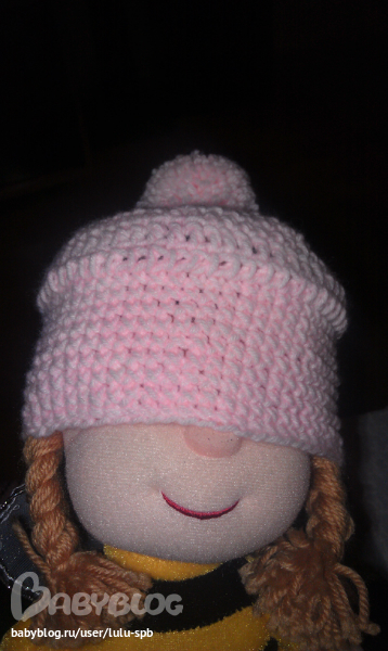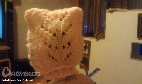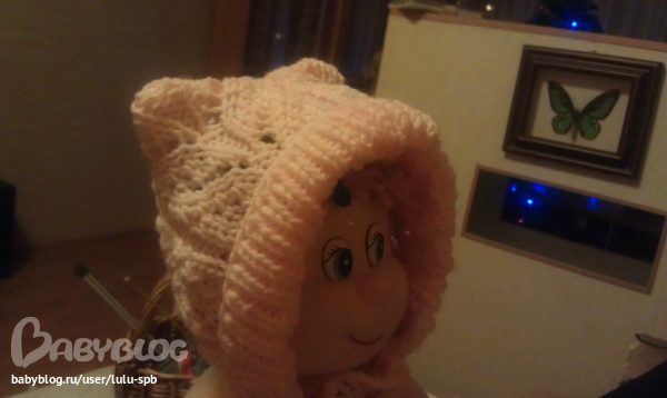 На выписку для дочи всё готово, оставалось только теплая шапчонка, нам обещала связать ее наша тетя (сестра моя), но у той не сложилось с вязанием категорически и остались мы без шапки... 30 декабря полезла я в Инетернет и наковыряла схему, Бог ты мой... сколько я раз распускала и опять набирала... вечно то лишние петли, но наоборот не хватало... но в итоге, я 31 декабря довязала шапку в восемь часов вечера))) вот что получилось)))