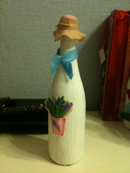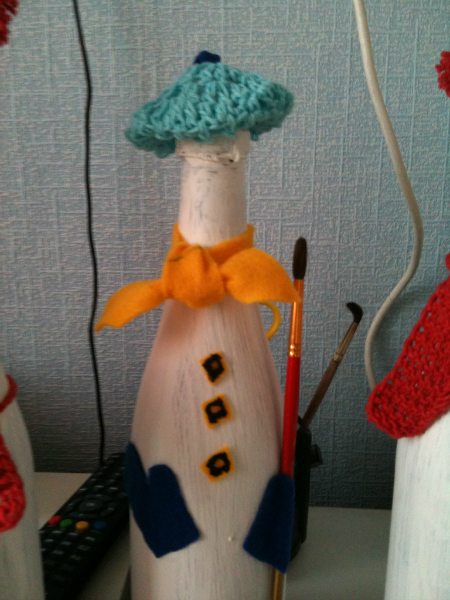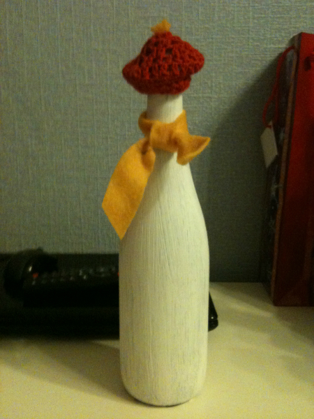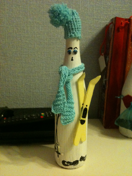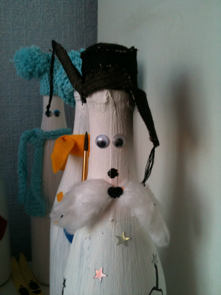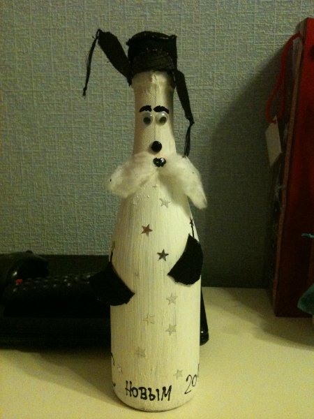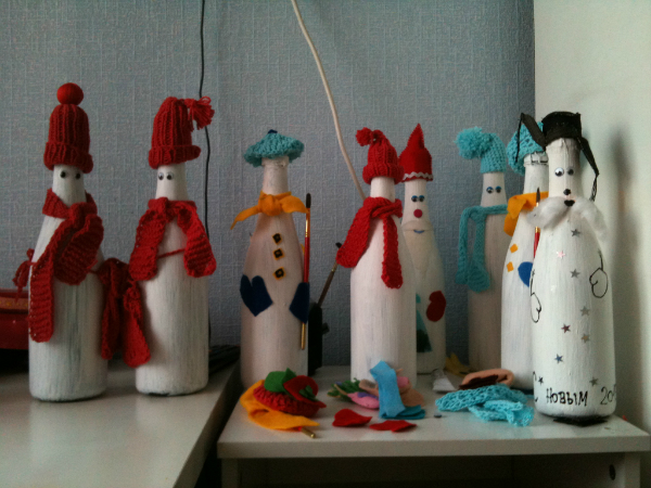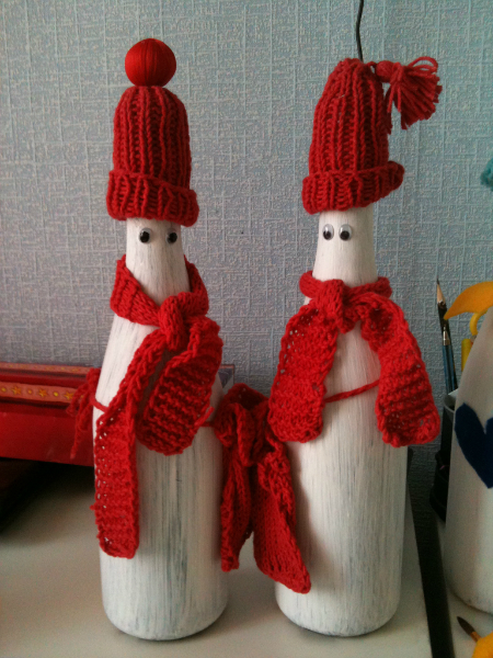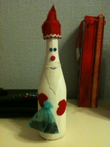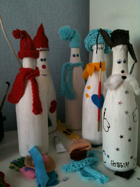 Декор, витражи.заранее прошу простить за качество фото! в тои году мы шампанское обвязывали чехлами, а в этом была идея сделать деда мороза, снеговика и снегурочку в подарки..