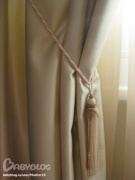 подхват и впрямь интересный, но я не подумала, что бисер - это стекло, и, следовательно, он очень тяжелый. Я думала им подхватить легкую тюль, но он годится только для тяжелых гардин.