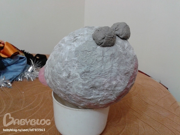 в обед на работе пришили один пододеяльник, к нему другой, сделали подпорки из пластика и проволки пришили глаза и рот) но наши мужчины так обрадовались, увидев его и еще до представления его ушатали бегая по гримерке с криками и воплями, так что веревка разошлась и мишура начала сползать во время выступления, но смеху было........