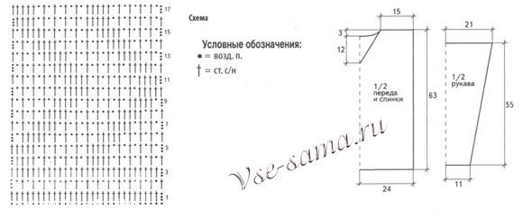 Рукава: наберите цепочку из 62 возд. п., вяжите основным узором. Провяжите 1 раз с 1-го по 17-й ряд, далее повторяйте с 6-го по 17-й ряд. Одновременно прибавляйте петли по краям для скосов рукава в соответствии с выкройкой. Всего с каждой стороны прибавьте по 19 п. Закончите работу на высоте 55 см (= 59 рядов) от начала вязания.