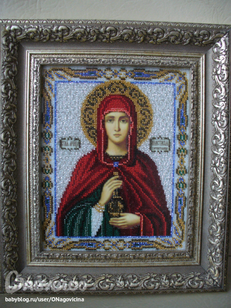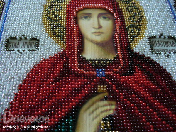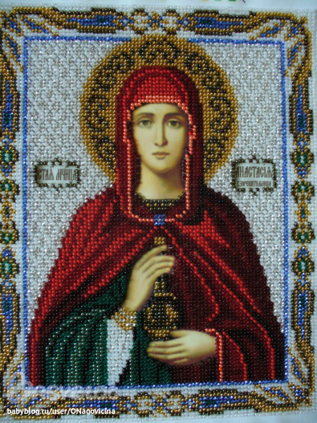 Моя свекровь родилась в день Анастасии узорешительницы 4 января и назвали её Анастасия. В подарок на день рождения вышила её именную икону. Это моя первая икона. Раньше вышивала картины, за иконы было страшновато браться, так как ответственность большая: на неё ведь молится будут. Перед вышивкой просила благословения у батюшки, вышивала с молитвой и чистыми мыслями, когда оформила, освятила в храме. Завтра буду дарить.