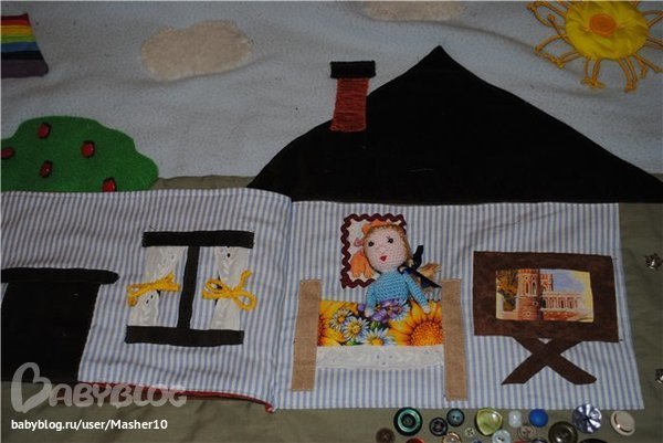 В центре дом с огородом и палисадником. Стенка домика откидывается – и перед нами предстает внутренне пространство дома. В комнате кровать-кармашек, куда можно положить спать куколку, и телевизор, у которого переключаются каналы. У меня правда, пока работает один, для остальных нужно еще насобирать и заламинировать картинки. Шторки перехвачены ленточкой на бантик – хорошая тренировка для пальчиков.