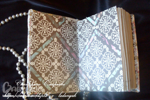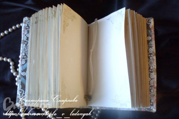 Формат А6. Обложка мягкая, сверху обтянута хлопком. 100 состаренных и проштампованных страничек, закладка - вощеный шнур с подвеской.