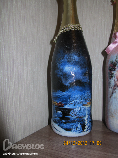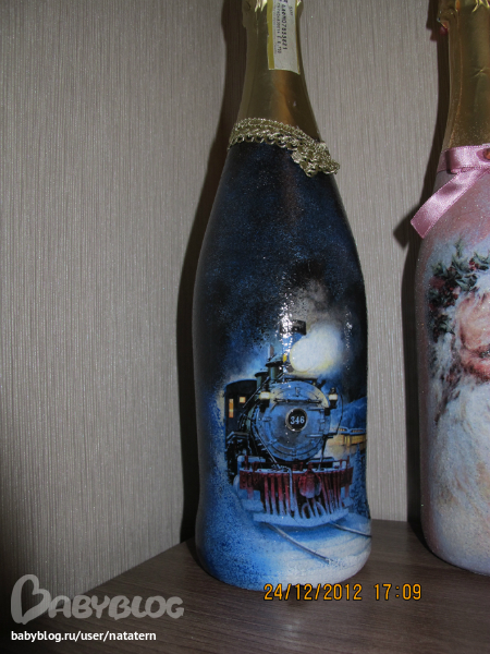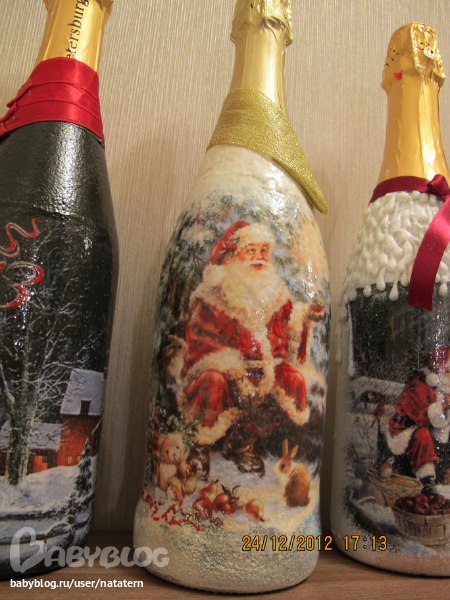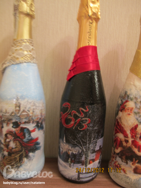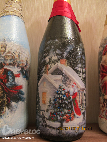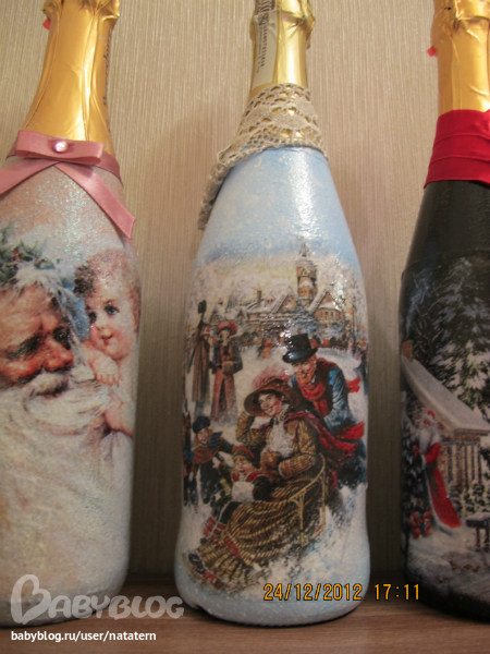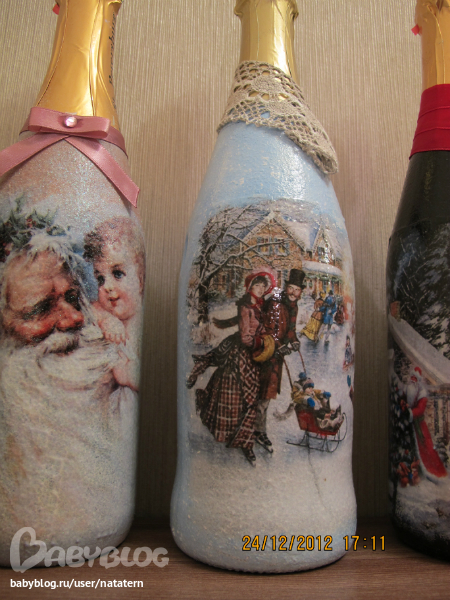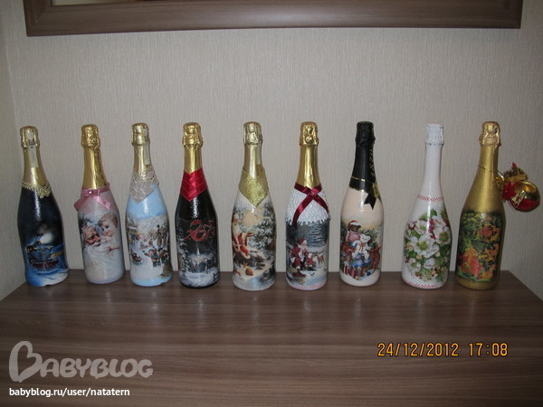 Долго я не решалась на декупаж бутылки. А тут накатило. Попробовала одну, другую, третью...а когда их все выставила, чтоб сфотографировать, так сама себе удивилась...уж не знаю сподвгнусь ли в след году на это)))