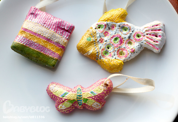 Солёное тесто (ТОЛЬКО ГОТОВЫЕ РАБОТЫ)С дочкой попробовали сделать украшения для елки. Вот, что у нас получилось.