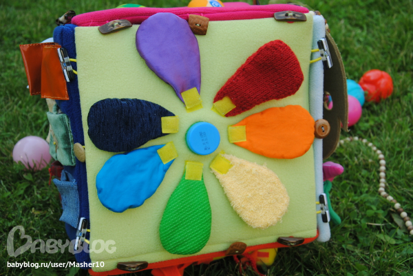 Итак, первая сторона - это цветик-семицветик. все листики крепятся на липе и все разнофактурные: красный связан из шерсти, оранжевый - флис, желтый - махрушка, зеленый - вафля, голубой - плащевка, синий - какаято мебельная бугристая тканька, фиолетовый - шелк. внутри каждого листика, кроме синдепона, еще что-нибудь развивающе-тактильное( мешочек с рисинками, целофан и т.п.)