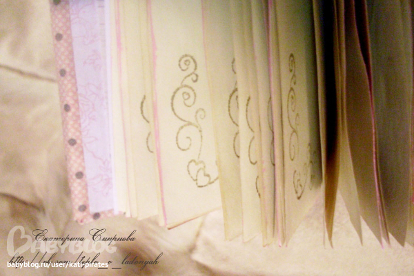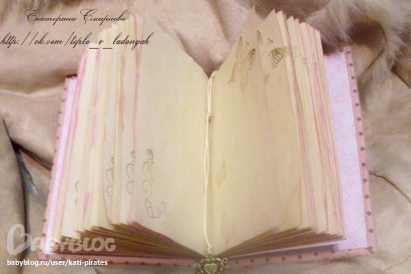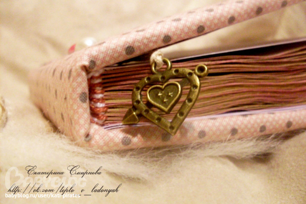 Формат А6. Обложка мягкая, сверху обтянута хлопком. Внутри 100 состаренных и проштампованных листочков. Классический коптский переплет, сплетенный двухцветный каптал. На переднем форзаце маленький кармашек для важностей. Закладка - вощеный шнур с подвеской) Срез тонирован розовыми чернилами)