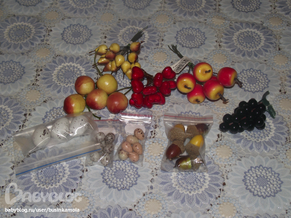 а это яблочки, грушки, чершня, виноград,жёлуди. сердечки и яички... теперь есть что положить в корзиночки своим куклятам))
