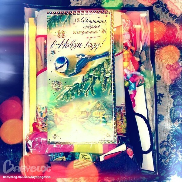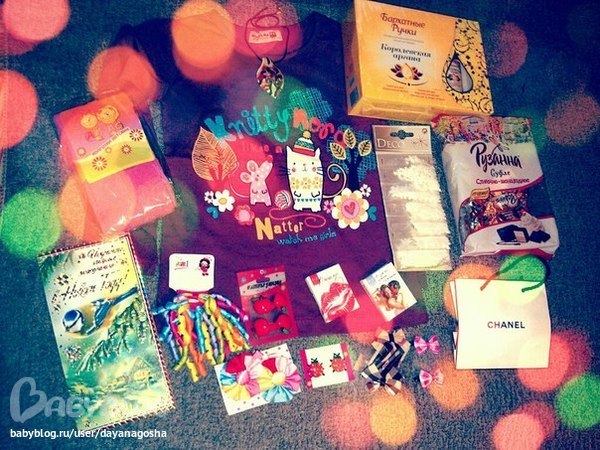 кофточка доче, 6 пар разных заколочек, колготочки, красивый кулон, вкусные конфеты, крем и скраб для рук, книжечки с цитатами о поцелуях и мужчинах, и конечно что же штучки для рукоделия)))