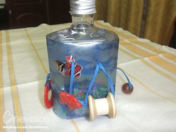 Сделала своему внучеку развивашку-перетяжку. Бутылочка обклеена витражной плёнкой-самоклейкой. В контейнере от бахил- бусинки в форме рыбки. В бутылочке насыпаны пластиковые бусины для шуршания.