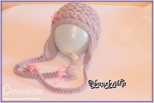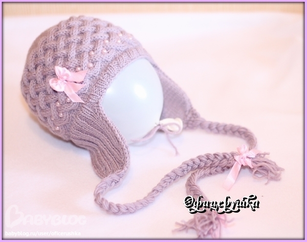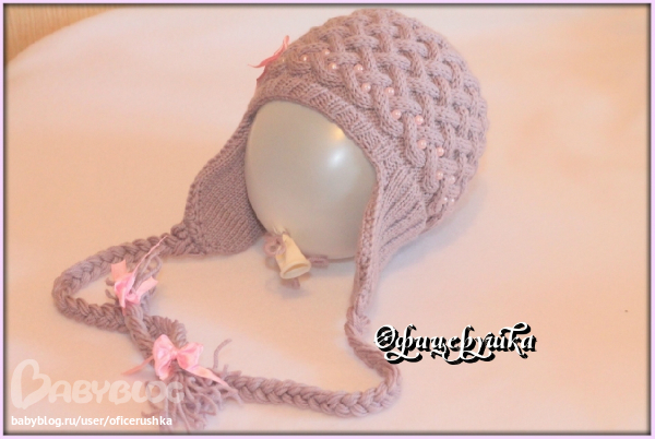 заказали у меня наверно известную всем шапочку на девочку 5 месяцев.пряжа Vita candy, 100% шерсть, спицы 3 мм, ушки вязала двойные, внешняя сторона - резинка, внутреняя лицевая гладь. шапка получилась достаточно теплая за счет узора - плетенки. ну намучилась я с ней! несколько раз распускала! но все таки доделала, результат нравится.