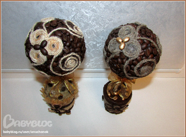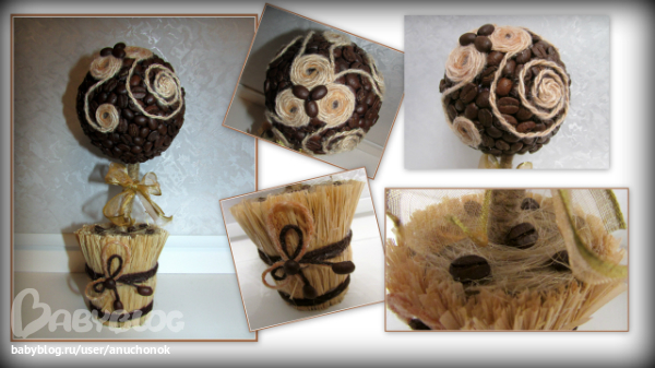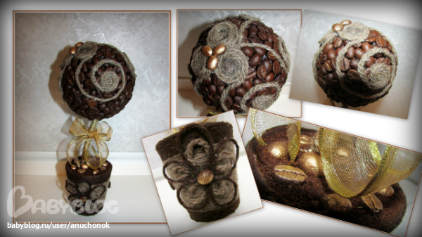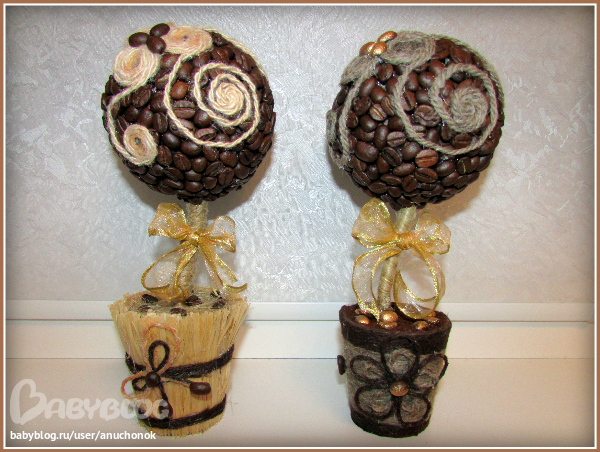 Давно заглядывалась на кофейные деревца - запали мне они в душу...И вот наконец перед новым годом решилась сделать парочку в подарок маме и свекрови..Ну конечно есть косячки, но в целом работой осталась довольна, делать их было очень приятно..))И муж конечно помог, без него со сверлением-пилением не спаравилась бы))) оформление кроны подсмотрела здесь, уж очень мне понравился такой вариант http://www.babyblog.ru/community/post/rukodelie/1728683