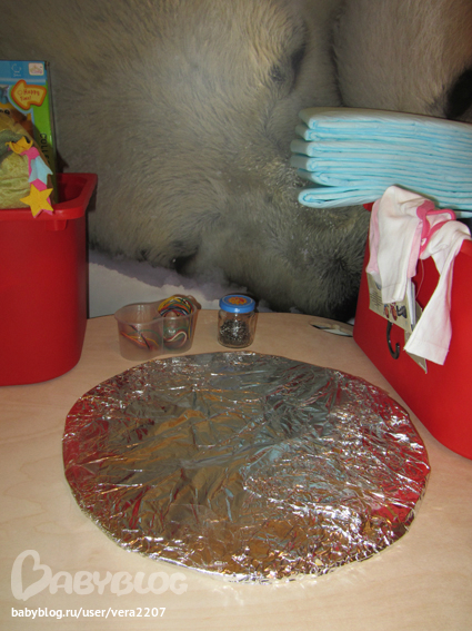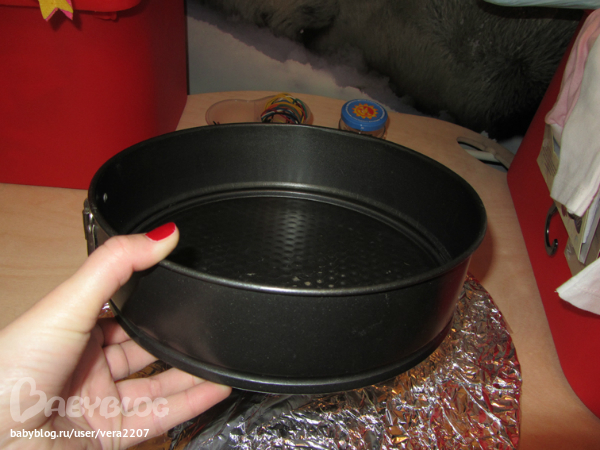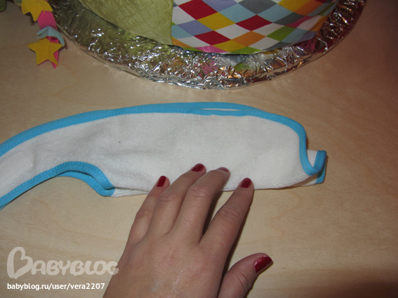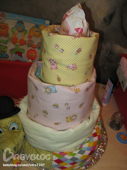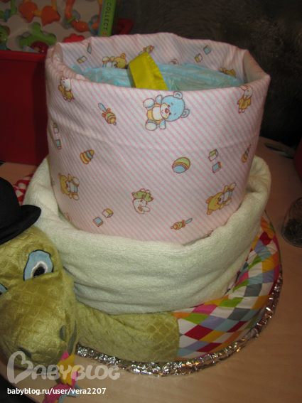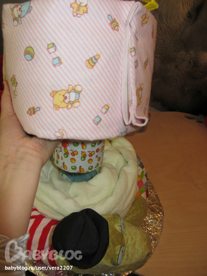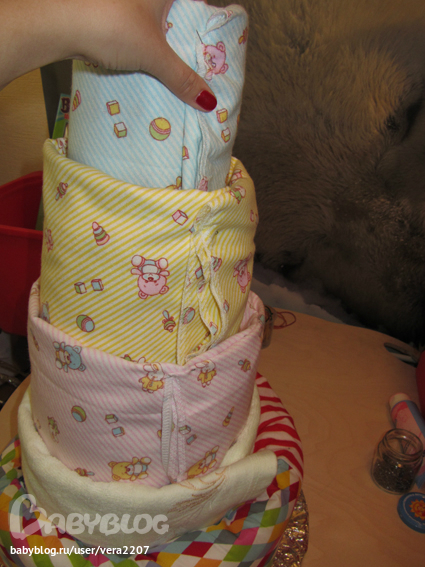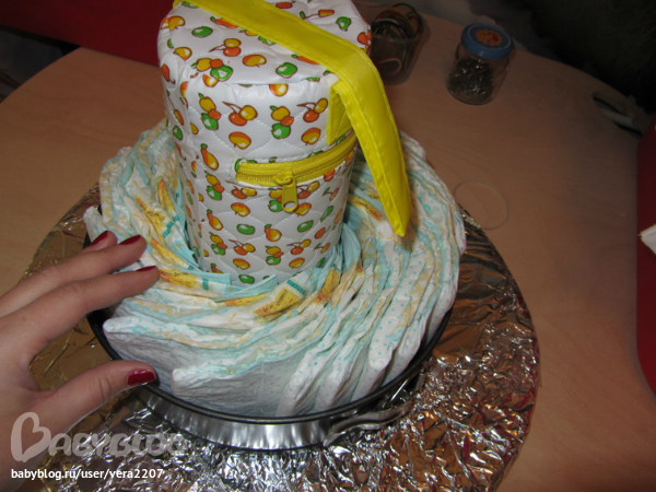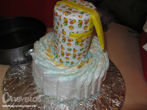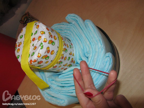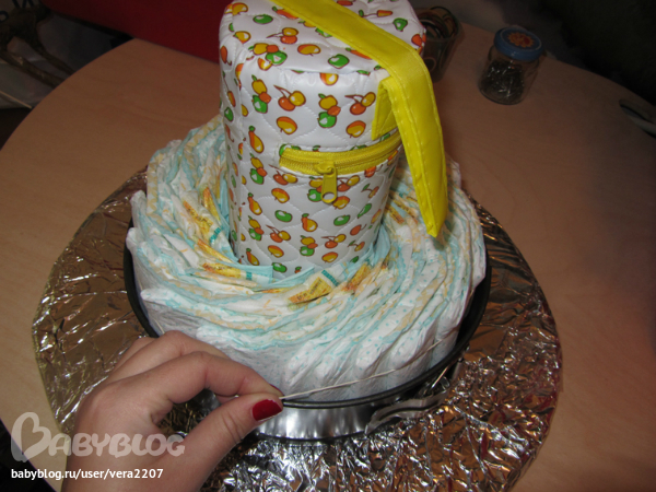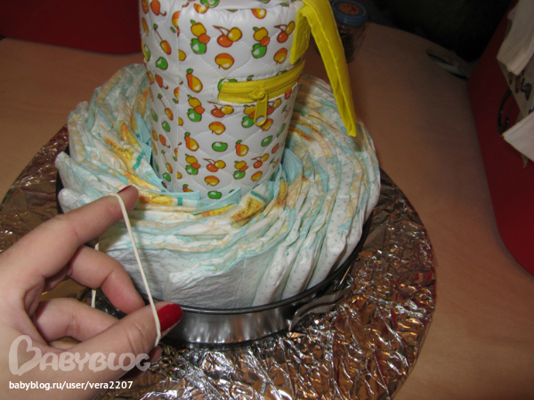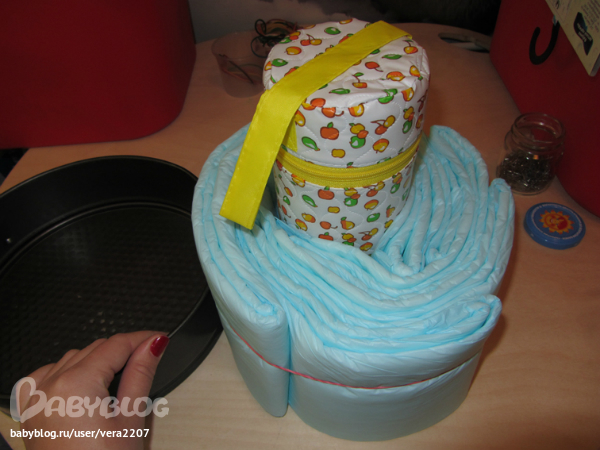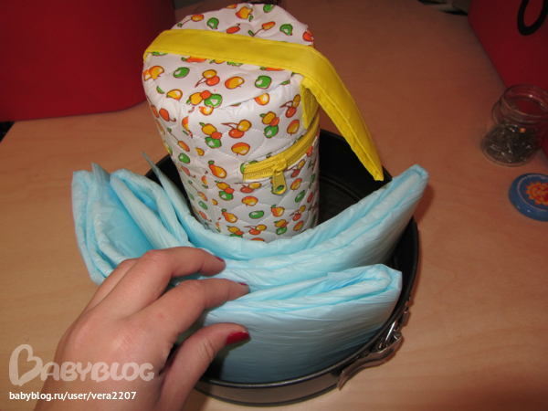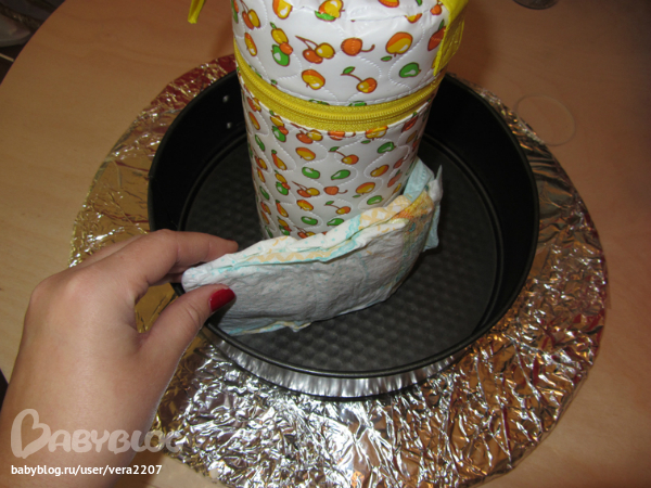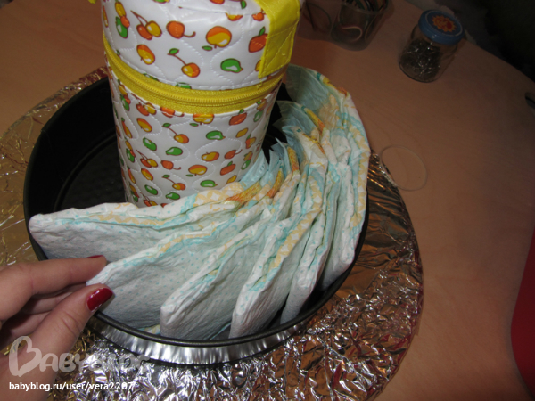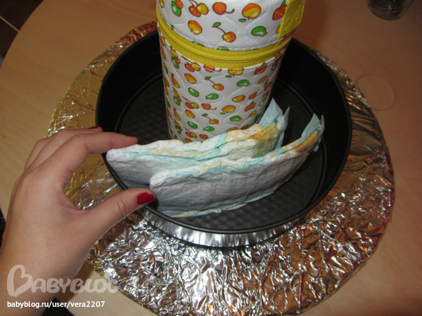 Для аккуратного расположения памперсов в слоях торта я использую круглую форму для выпечки.