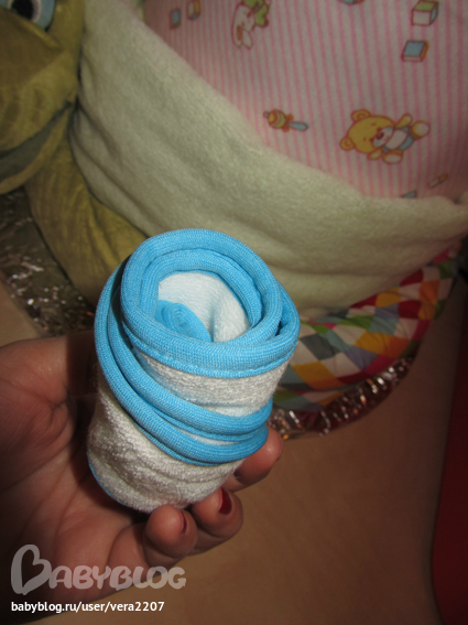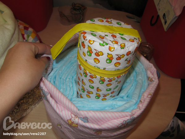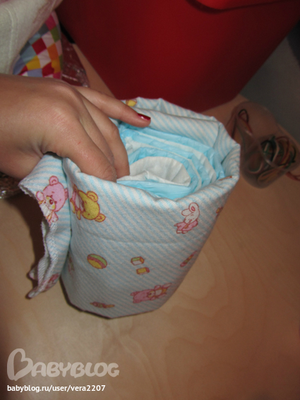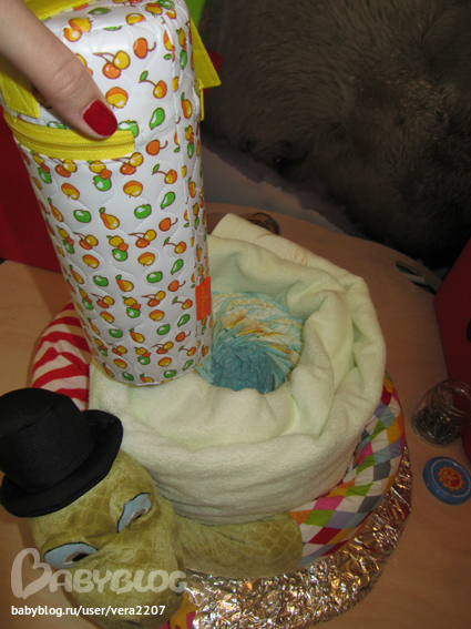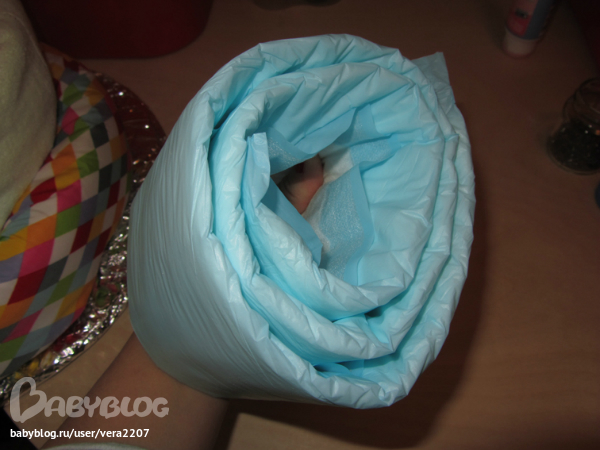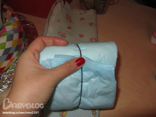 Вокруг основы (термос или бутылочка или бутылка шампанского - на ваше усмотрение) выкладываю памперсы.