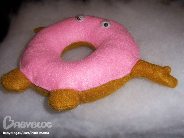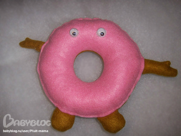 Но я ожидала большего интереса к его персоне, но ошиблась. И да, да :) руки получились разные. Одну прострочила сильнее, чем вторую, а переделывать совсем не было времени. Глазки делала сама из таблетной упаковки и бисеринок. Ныне они уже малость пожмяканые. Это ж самый интересный объект на чудо-пончике :))) и всегда попадающий под пальчики.